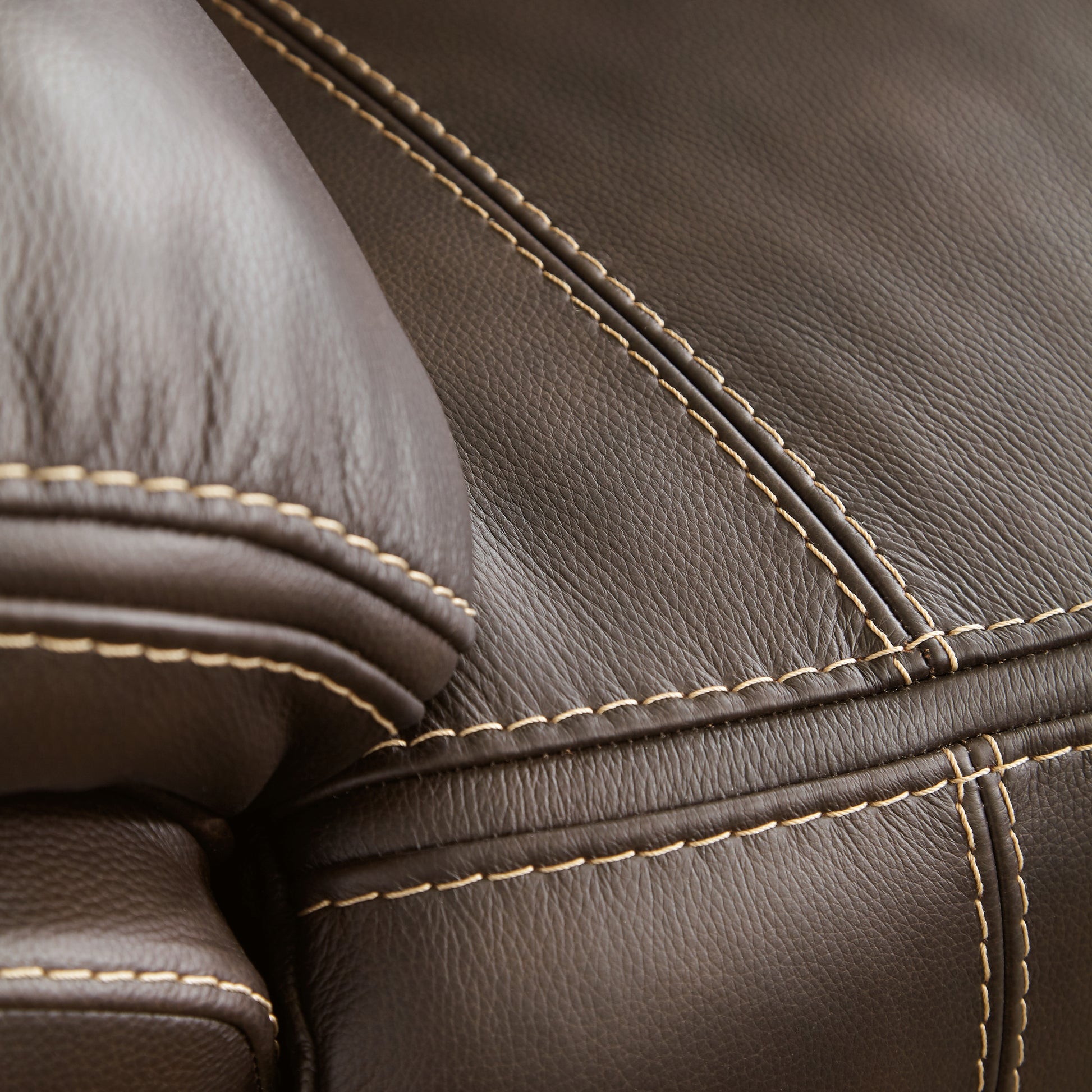 Load up on comfort in a cool, clean-lined and contemporary way with this power reclining loveseat in chocolate brown. Rest assured, the expertly matched leather and faux leather upholstery is enriched with a pebble grain effect for authentic appeal and enhanced with jumbo stitching for dramatic contrast. It features a one-touch power control with adjustable positions, along with an Easy View™ adjustable headrest that allows a primo view of the TV even when you're reclined. Extended ottomans provide extra length for leg comfort. A zero-draw USB plug-in at your fingertips lets you charge up as you chill out.
