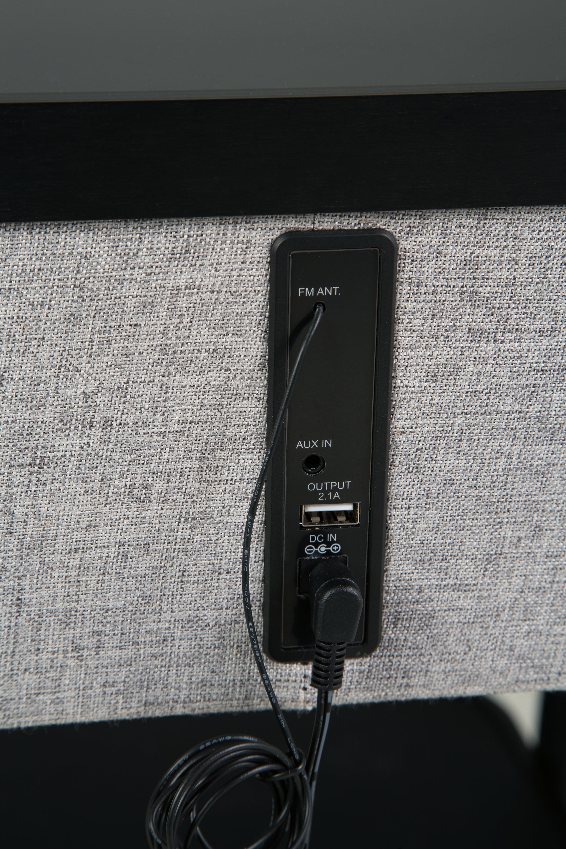 - Wireless connection; FM antenna; aux input; USB charging port