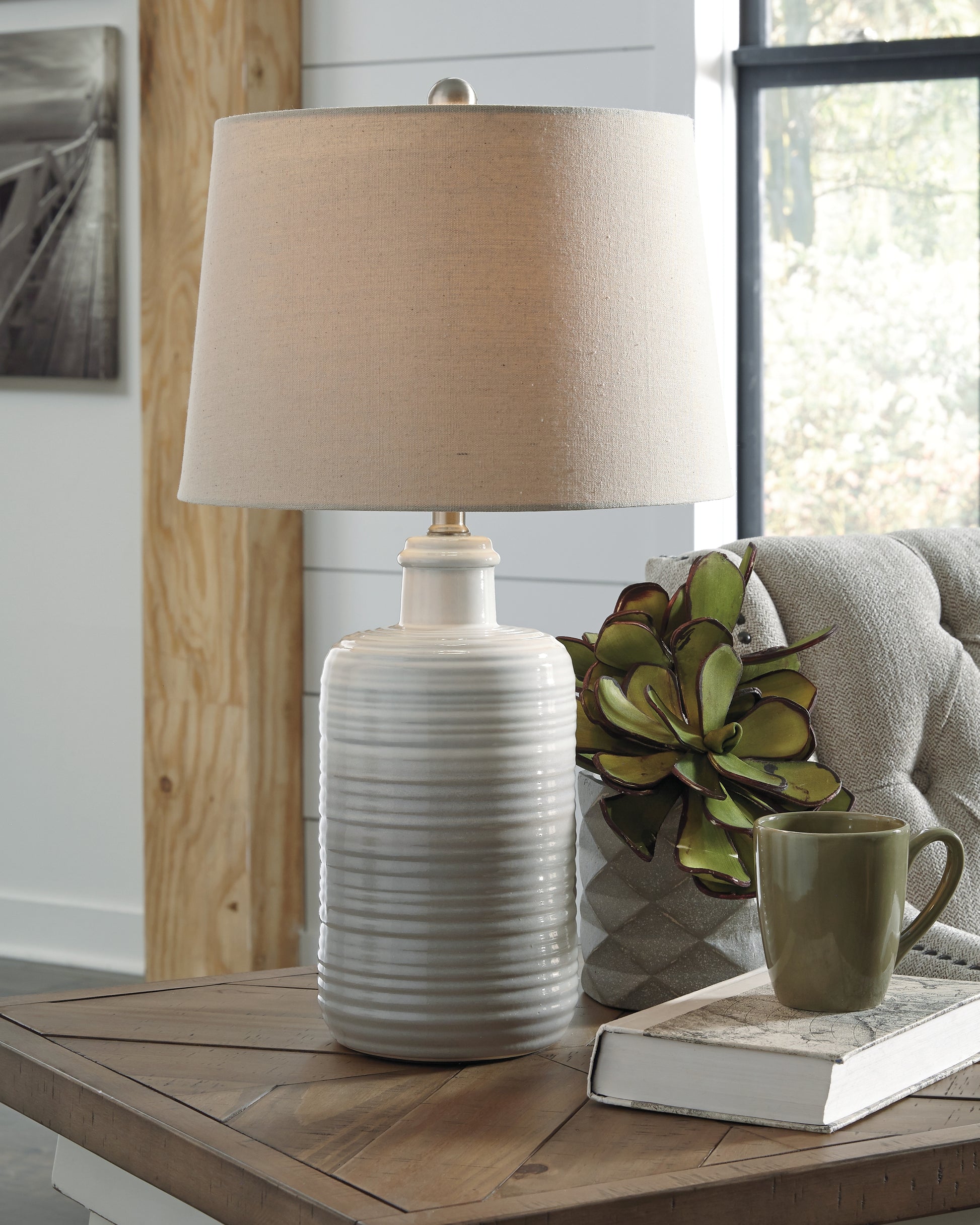 - Made of white and taupe glazed ceramic with modified drum shade