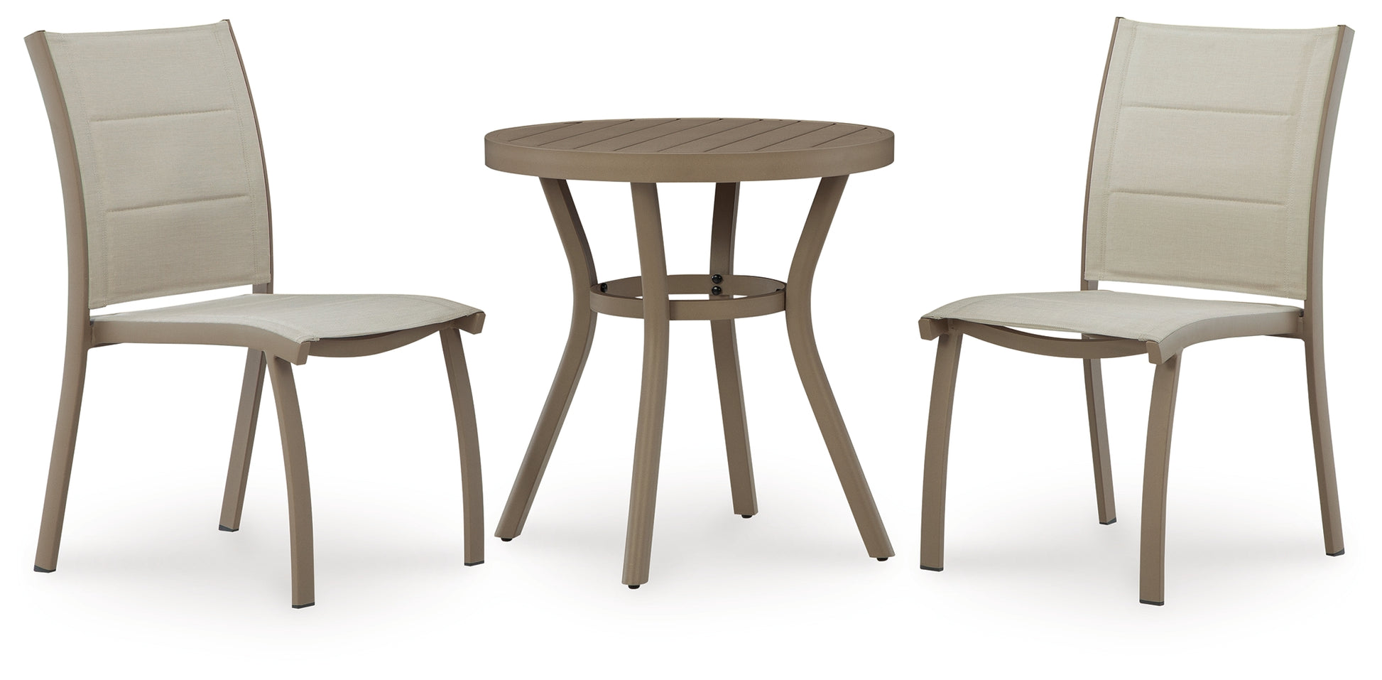 Craft a chic outdoor seating area with this table and chair set. Outfitted in contemporary neutral hues, it's an ideal spot for sipping drinks poolside or relaxing on the porch. Sturdy aluminum construction and sling seating round out the set with both durability and comfort.