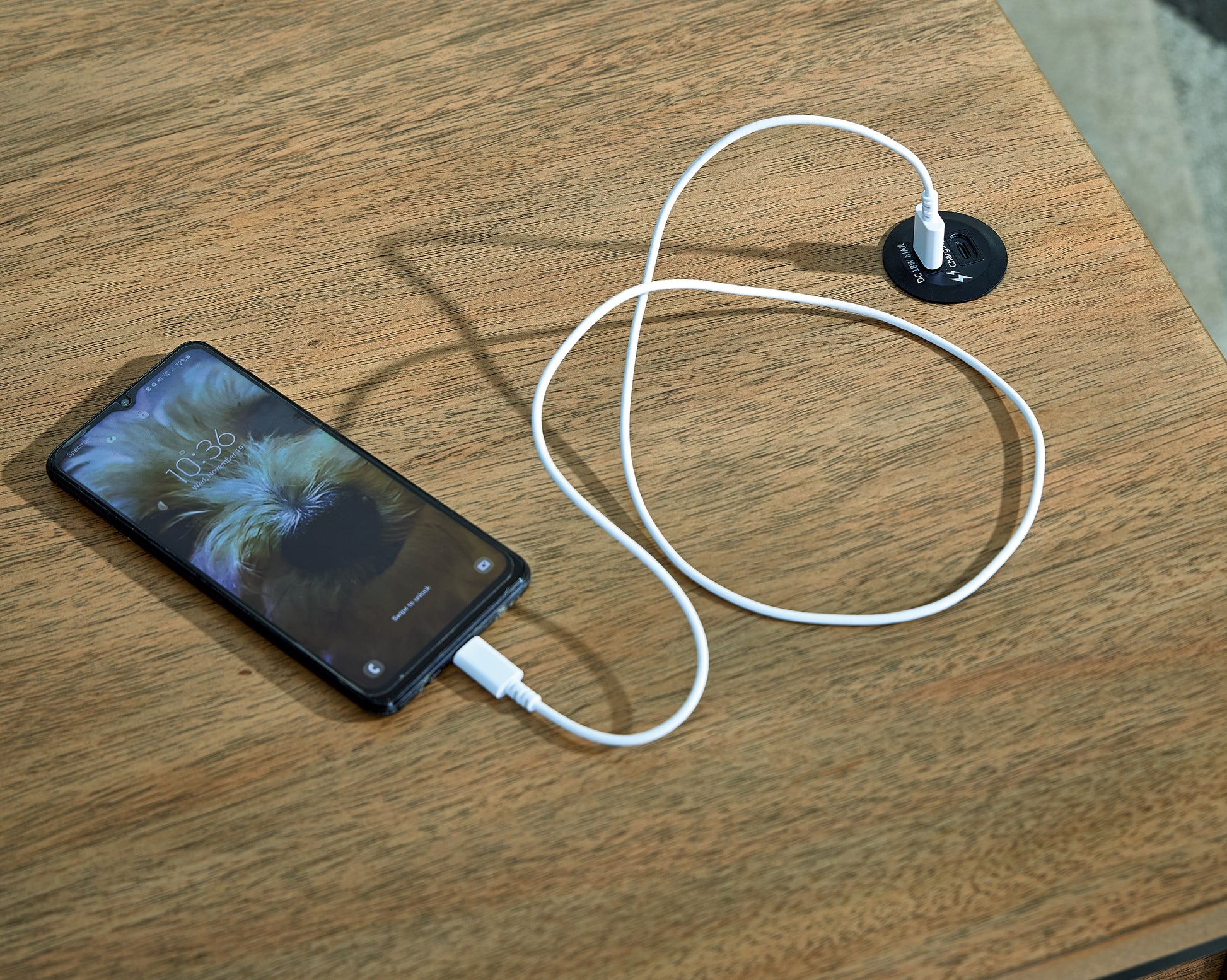 Give your space a sleek, urban edge with this end table. A light brown wood-tone finish and a contrasting gunmetal gray frame create a modern mixed-material look that pairs effortlessly with today’s sofas and sectionals. Two smooth-gliding drawers keep remotes, tech and clutter neatly out of sight. Convenient USB charging means your devices are close by and good to go. This table is polished, put together and needs a good home.
