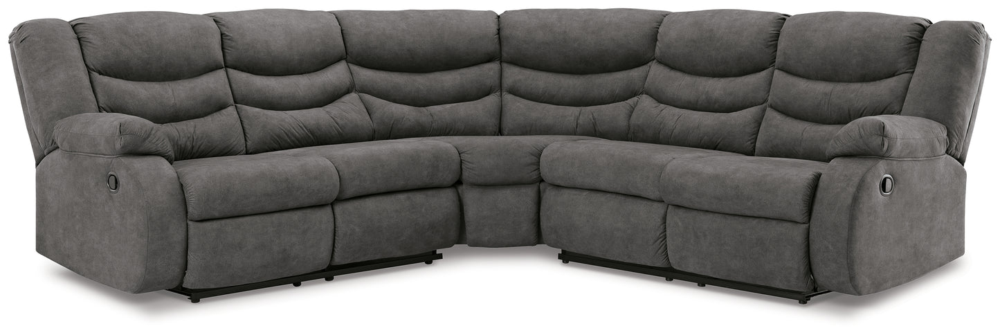 Affordable luxury made easy. An essential for living room lounging, this sectional is a star in social spaces. Its sleek slate gray faux leather is well-suited for mixing and matching with your existing pieces. Pull tab reclining keeps you and your companions covered when it comes to comfort. And this functional piece is equally as fashionable, with design details like a channel-stitched back incorporating subtle visual interest.