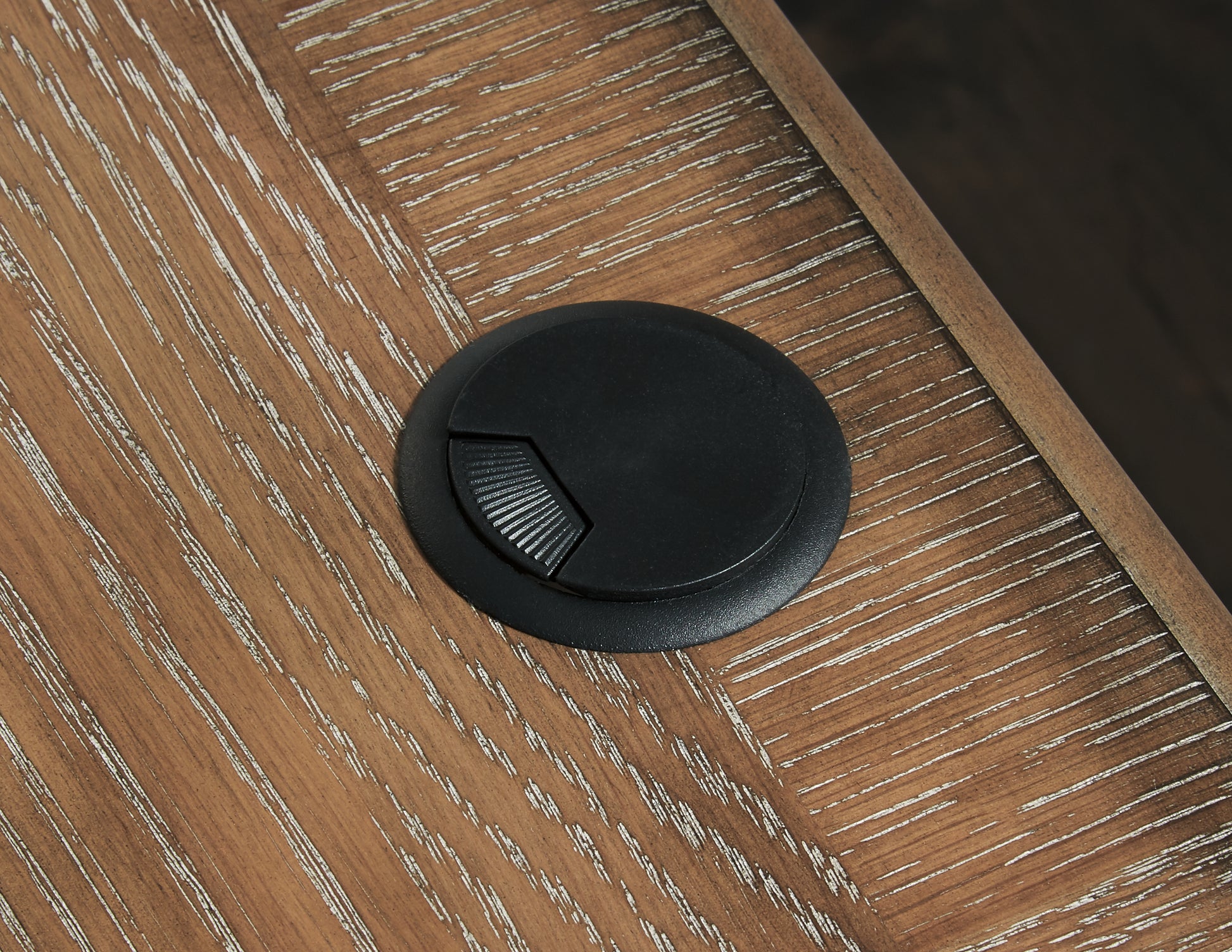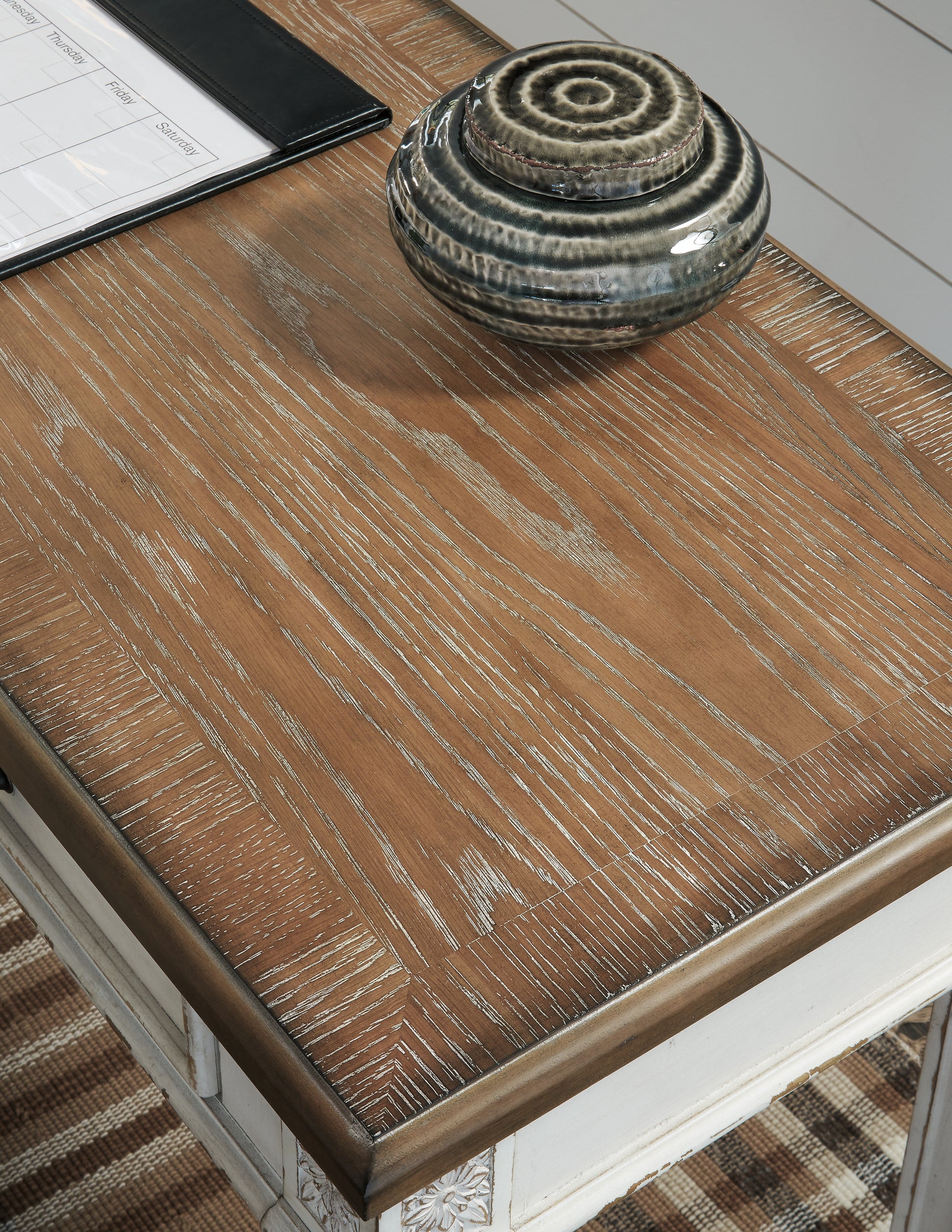 Elevating the art of traditional cottage styling, this L-shaped desk is your heavenly home office realized. Its two-tone finish combines chipped white with distressed wood tone tops for added charm. Framed drawer fronts, decorative corbels and elegantly turned and tapered legs add refinement, while dark bronze-tone knobs lend a classic touch. And this desk is also built for productivity. A spring lift top raises the surface to a comfortable standing position, while the built-in power supply and dual USB ports keep your devices close at hand and ready to go.