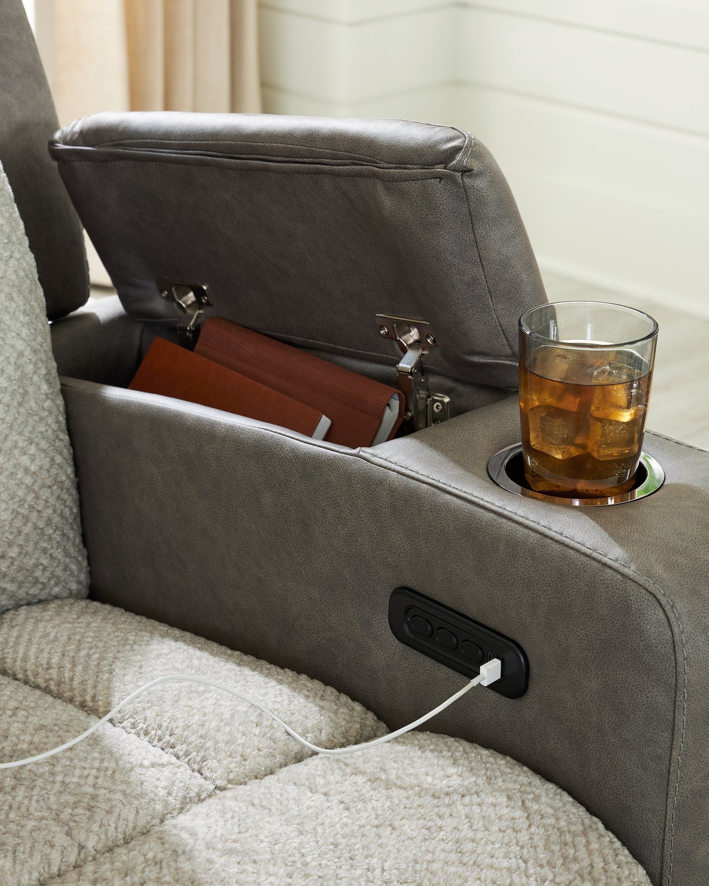 Refined relaxation, reimagined for the modern home. This power reclining loveseat combines premium comfort with smart features like built-in storage arms, USB charging and cup holders. One-touch reclining and adjustable headrests let you find your perfect position, while luxurious heat and massage functions melt away the day's stress. And for an added dose of style, it's wrapped in a two-tone upholstery that pairs soft textured fabric with coordinating faux leather.